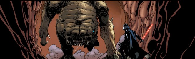 So while Vader is fighting his way to Cylo and his traitorous army of cyborgs, space whales, and all kinds of technological terrors, he comes face to face with a cybernetically enhanced rancor. Specifically designed to fight Vader. It is a minor inconvenience for him but still pretty metal.