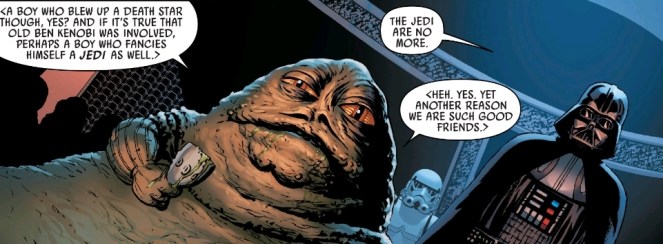 Darth Vader visits Tatooine to make a deal with the Hutts for trade routes and materials. A little small talk about recent catastrophes for the Empire turns to talk of that mysterious pilot…