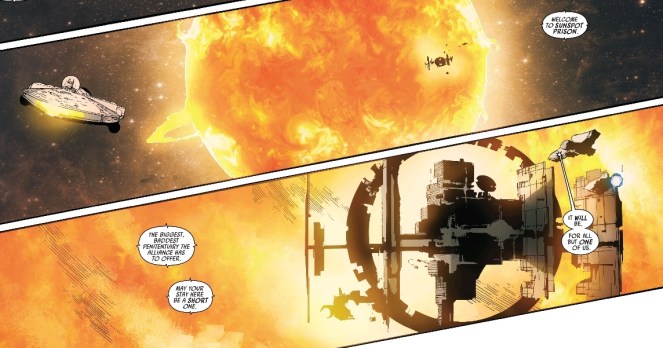 Leia and Sana bring their captured Doctor Aphra to Sunspot Prison. A prison by a sun is pretty metal.