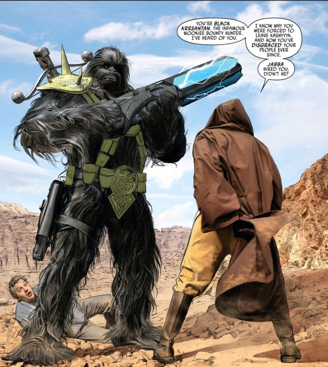 After Jabba’s previous thugs and their unfortunate altercation (AKA getting wrecked by a certain secret hermit,) Black Krrsantan is on the case! Looking for the mysterious culprit, the wookiee is out roughing up some locals when he starts messing around with the wrong family.