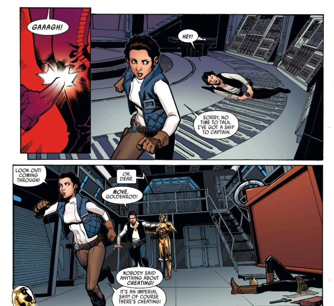 So who’s gonna captain the ship? Let’s race for it! I admit, it’s an awfully middle school solution, but it fits well with Han and Leia’s flirting levels!