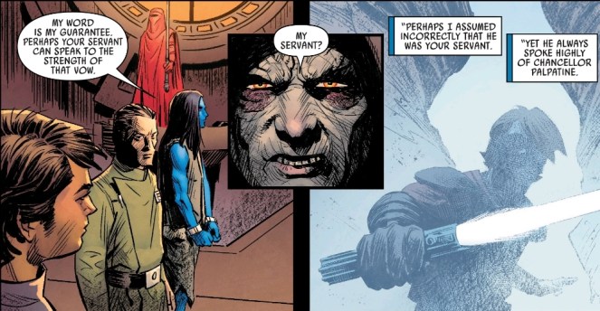 Palpatine congratulates his new Grand Admiral and Thrawn lets it be known he knows there are secret projects he is curious about.