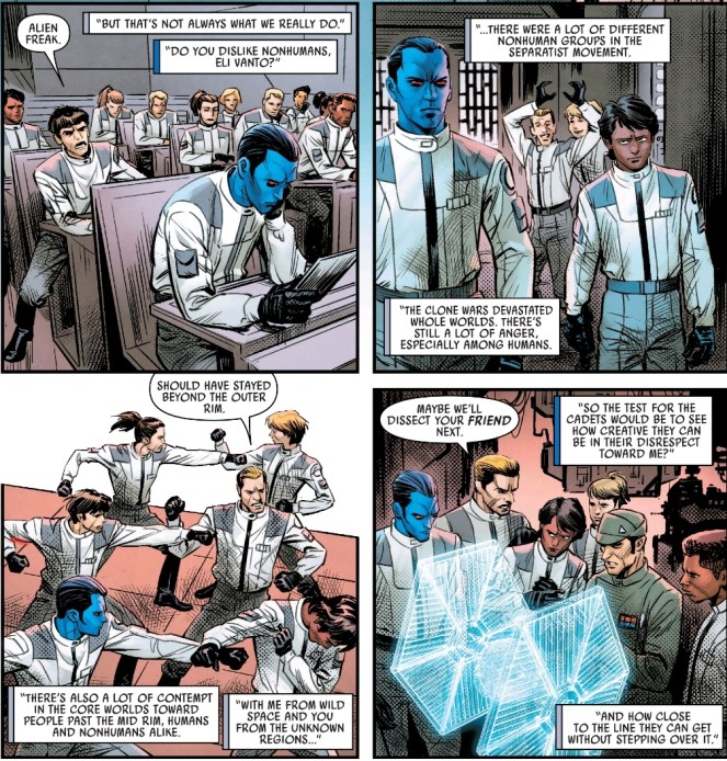 On his fast track to career success Thrawn’s cadet days are filled with rampant bullying and racism by his fellow Imperials-to-be. As we all know, non-humans are not looked upon fondly in the Empire.