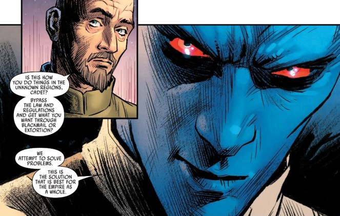 Thrawn’s mission outlook and priorities along with his lack of political savvy continue to be the one weakness of his rise in the ranks.