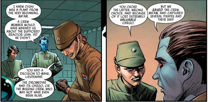 As Thrawn moves swiftly up the ranks there are a few occasions where the Empire does not share his optimistic appraisal of the situation. Thrawn is berated for things like putting the lives of a crew above recovery of the cargo. He starts to see where exactly the Empire’s priorities lie.