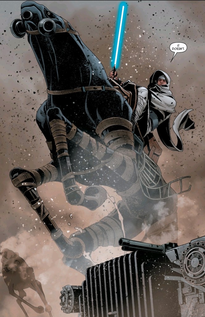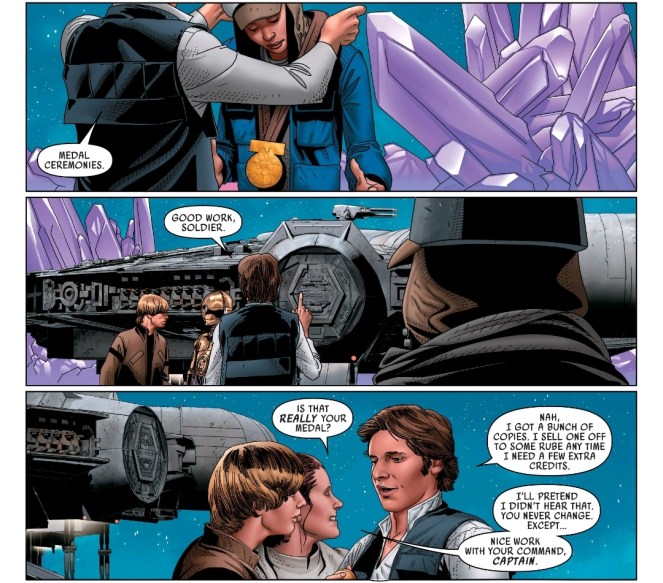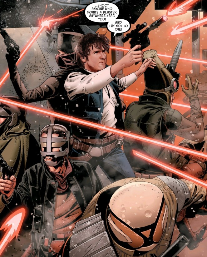 Han Solo befriends a Partisan leader named Ubin, who was formerly alliance but returned home to Jedha and the Partisans after The Battle of Yavin. Han too, begins to accept the weight of leadership placed on him.