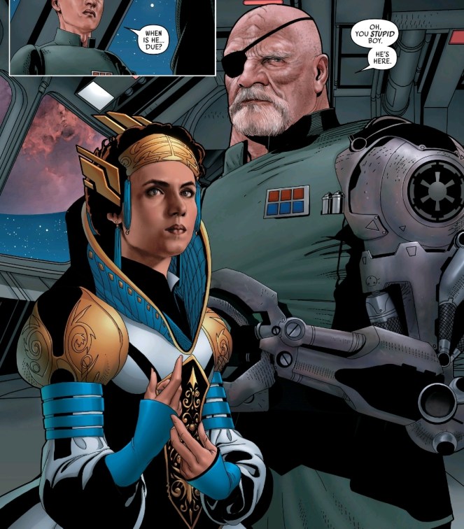 How exactly are the Imperials going to mine a devastated moon? With the help of Queen Trios of Shu-Torun, who’s entire culture is built upon mining in the most inhospitable conditions. Oh and this really savage Imperial officer guy who has a cyborg arm with a flamethrower.