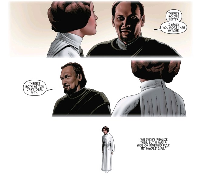 A lot of memories and connections to Rogue One happen in this series. Leia remembers the last words she was given from her father.