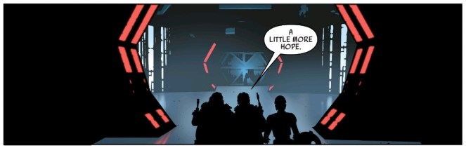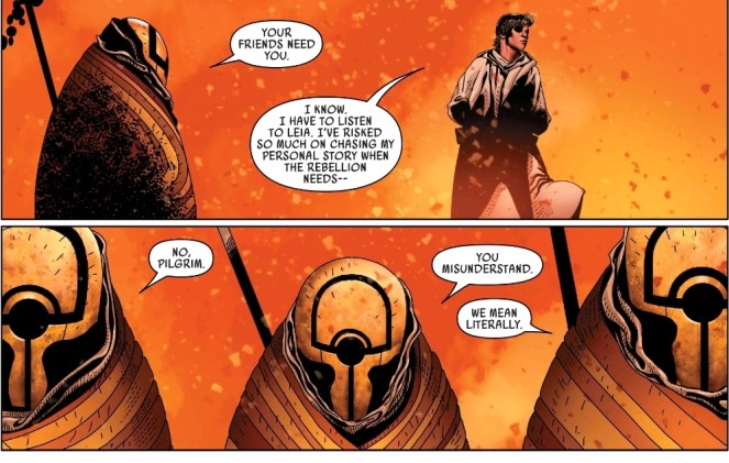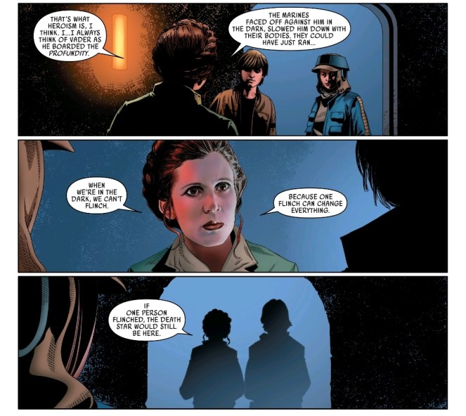 Luke, new to the rebellion, learns the story of Jyn Erso and Rogue One. Here is where he begins to understand the price, responsibilities, and hope everyone places on each other. Leia, as always, explains it best.