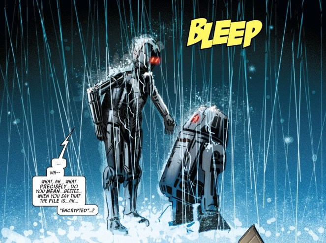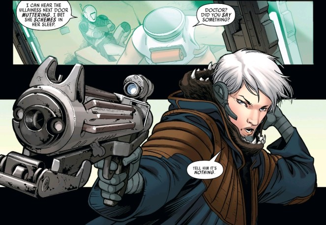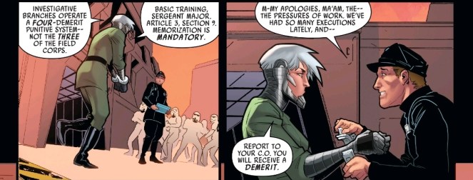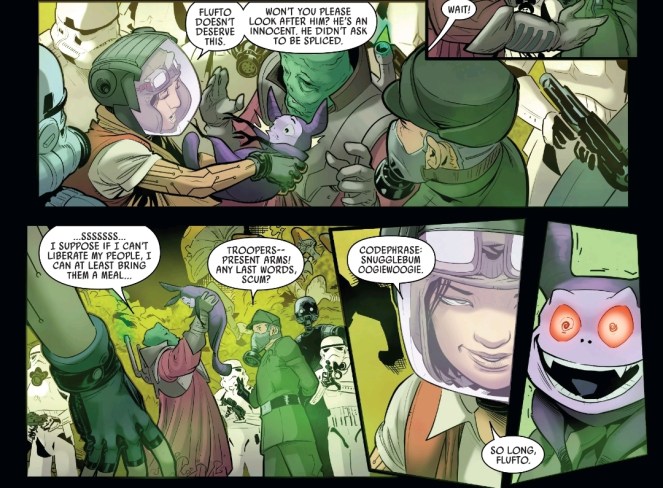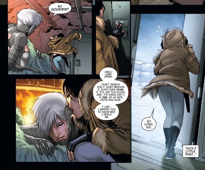 Well hello there super cute Imperial! Aphra does her best not to kill this Imperial and has a little friendly but deep discussion while holding her hostage.