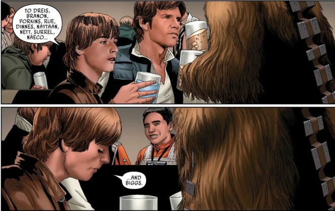 Luke, Han, Chewie, Wedge, Hobbie, and Zev all get together for some blue milk and remember the fallen.