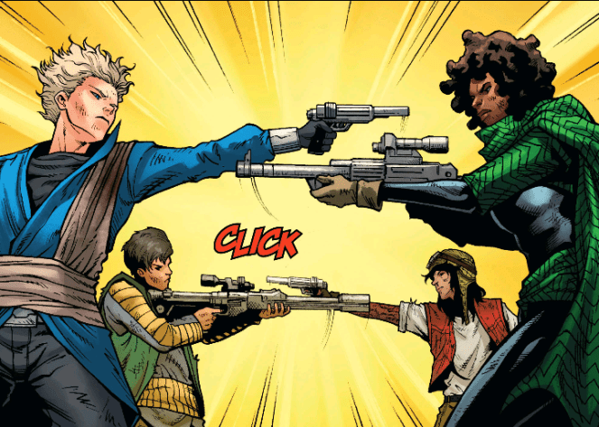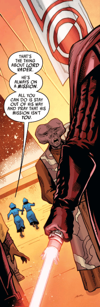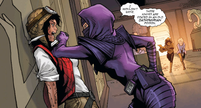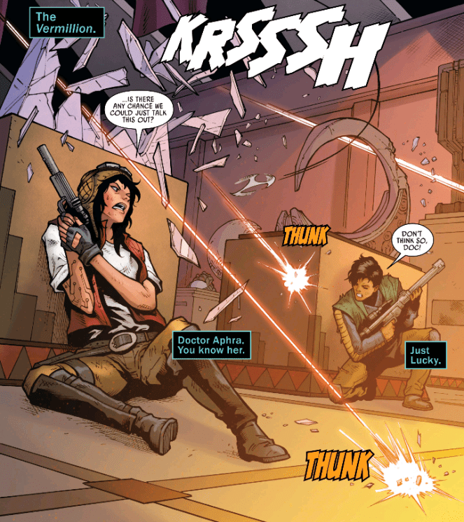 Doctor Aphra’s part in the story has very little to do with Solo but hey, she does come across riches and info that seem to put Crimson Dawn right in her path going forward. Sana, Lucky, and Ariole have some great moments and I’m really liking seeing them all together. Hopefully, it’ll happen again sometime! There is plenty of classic Aphra chaos, craziness, and even dark side artifacts!
