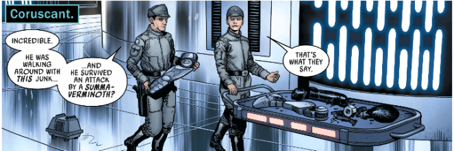 A couple of Imperials wonder how Vader survived a massive space beast with a bunch of outdated droid tech. Vader is way more than the sum of his parts.