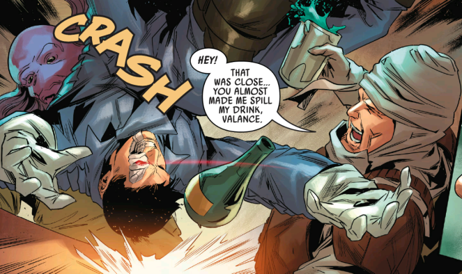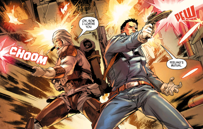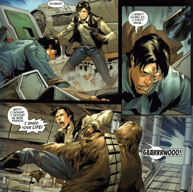 Back in the day, Valance was on a job and didn’t realize the mark was Solo. Once he figures it out, Valance turned on his team and saved Solo. In the confusion, Solo saw Valance and assumed he was the assassin. Since then Valance has always wanted to explain himself… which is gonna be difficult with the listening party in carbonite.