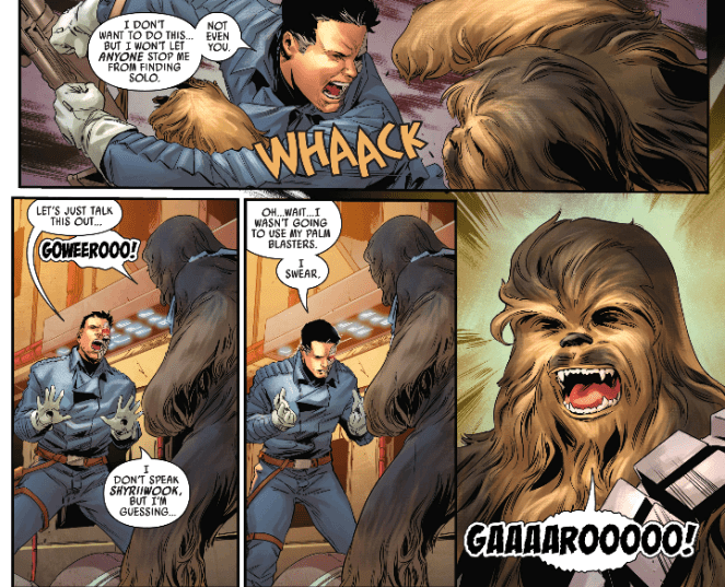 On Nar Shaddaa, Valance runs into Chewie and is able to clear a little bit up after a heated wookiee fight. It also doesn’t help that Dengar is along for the ride…