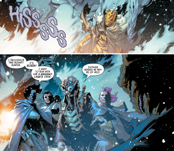 After a savage defeat on Nar Shaddaa and losing his best friend (See: War of the Bounty Hunters: 4-LOM & Zuckuss #1) we find Zuckuss being very sad on a Gand floating sanctuary.