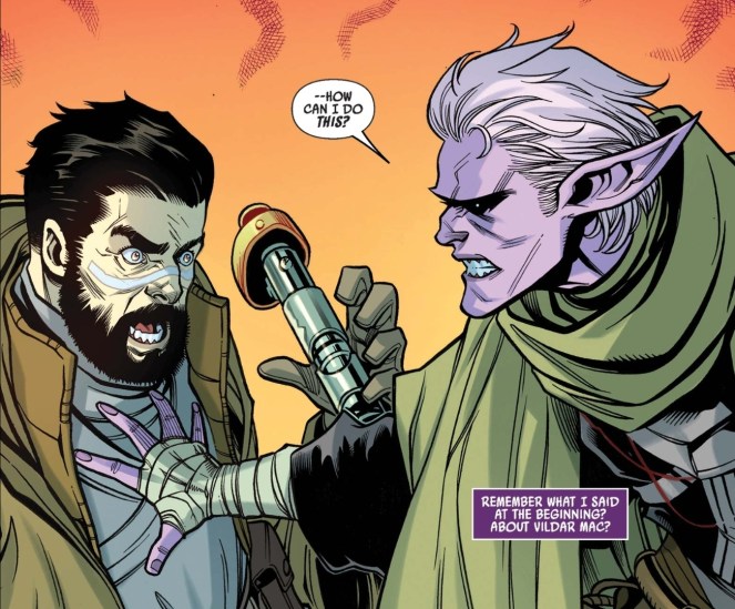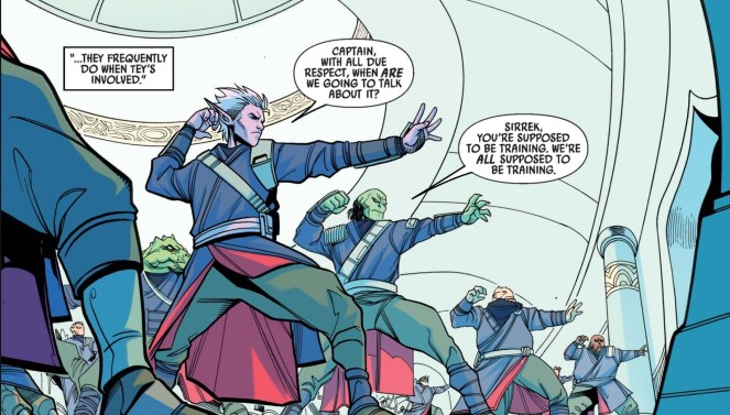 Chaos and violence boil over on Jedha and everyone is a target. The art by Ario Anindito and Andrea Broccardo is beautiful, dynamic, and expressive. The energy of the story is definitely lifted up by the artists. I love seeing more of Jedha and some of its past as a holy city. I also enjoyed seeing more Force organizations all coming together. While I’d definitely like to dig deeper into each of their belief systems and culture, it’s fascinating to see them interact and work together. The Path of the Open Hand plays a huge part in this series, and the events on Jedha if you’ve been following more of the other stories from Phase II of The High Republic… Tey is such an enjoyable breath of fresh air and his interactions with self-serious Vildar always brings a smile to my face.