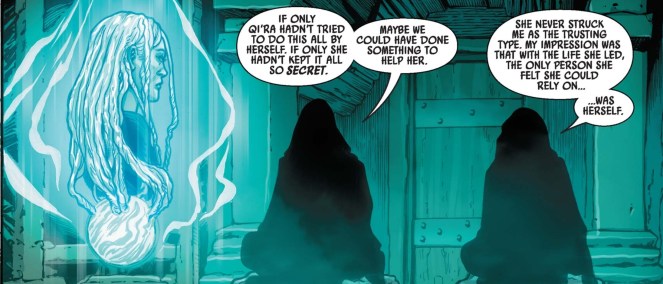 Two hooded figures listen to the Archivist recount Qi’ra’s story. The commentary is insightful and the reveal is worth the wait.