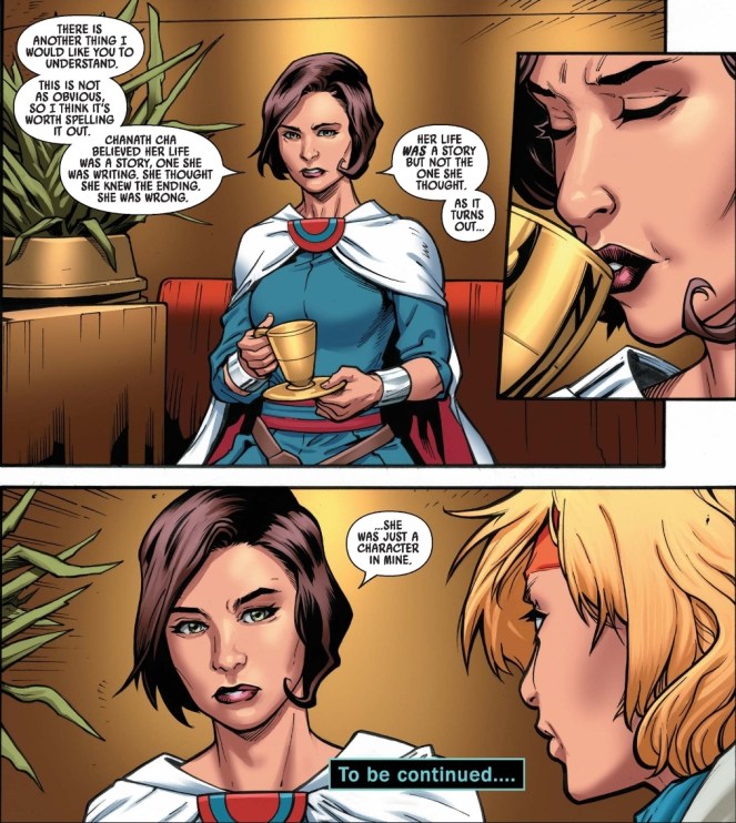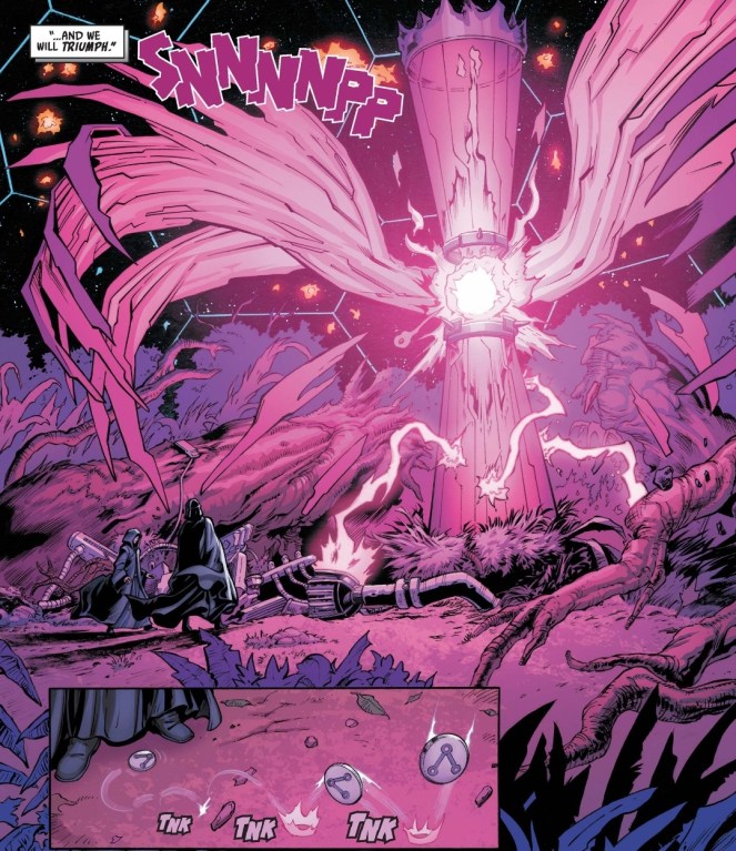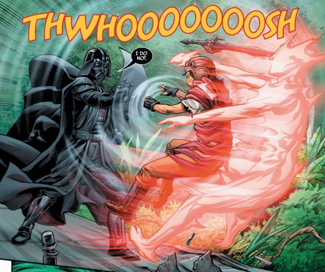 Darth Vader is confronted by the Spark Eternal-possessed Aphra (It’s a whole thing…) After they cross blades, Vader knocks the soul out of the rogue archaeologist!