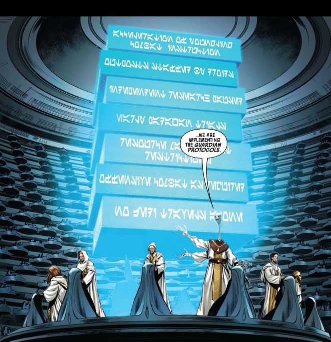 Now that the Jedi are a straight-up Ralph Wiggum meme (I’mindanger.gif), precautions must be taken. The council recalls all Jedi to Coruscant and implements the Guardian Protocols during this crisis. The protocols state: