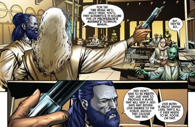 The lightsaber smiths have to make adjustments too. To keep the order stocked with combat-ready lightsabers they must let go of their time-consuming handcrafted artistry in favor of quantity…